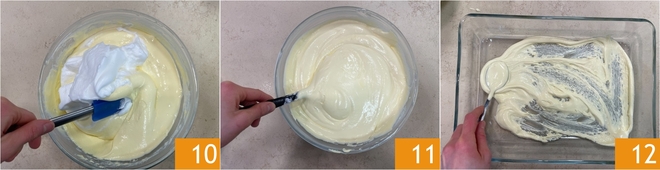 Anschließend gebt ihr das restliche Eiweiß auf einmal dazu und hebt es sehr vorsichtig von unten nach oben unter 10. Die Mascarponecreme ist jetzt fertig 11. Verteilt einen großzügigen Löffel auf dem Boden einer 35x25 cm großen Glasform und streicht ihn gut über den gesamten Boden 12.
