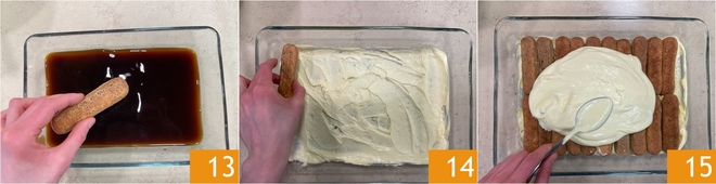 Taucht die Löffelbiskuits für wenige Augenblicke in den kalten Kaffee, zuerst auf einer Seite, dann auf der anderen 13. Verteilt die getränkten Biskuits nach und nach in der Auflaufform und versucht, sie alle in eine Richtung zu legen 14, so entsteht die erste Schicht. Gebt etwa die Hälfte der Mascarponecreme darauf und streicht sie gut 15, sodass die Biskuits vollständig bedeckt sind.