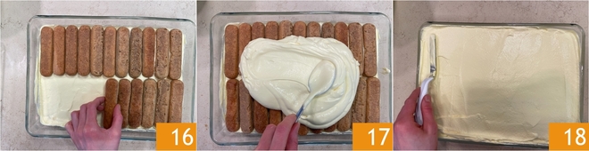 Legt nun die mit Kaffee getränkten Löffelbiskuits ordentlich darauf (16), macht eine weitere Schicht mit der restlichen Creme (17) und streicht die Oberfläche glatt (18).