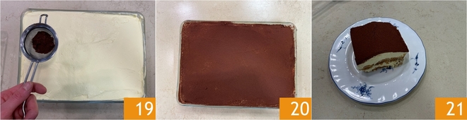 Bestreut das Ganze mit ungesüßtem Kakaopulver 19 und lasst das Tiramisù im Kühlschrank für ein paar Stunden fest werden 20. Euer Tiramisù ist bereit zum Genießen 21!