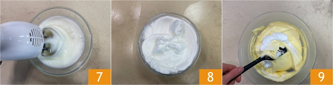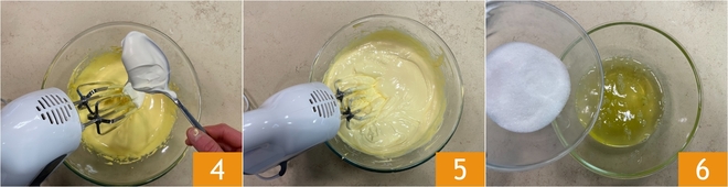 Mit laufenden Rührstäben könnt ihr nun nach und nach den Mascarpone dazugeben 4, bis eine dichte, kompakte Creme entsteht 5; stellt diese beiseite. Reinigt die Rührstäbe gründlich und schlagt nun das Eiweiß steif (ihr benötigt etwa 360 g). Gebt es in eine Schüssel und fügt den restlichen Zucker hinzu 6.