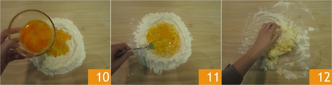 Geben Sie die leicht verquirlten Eier hinein 10 und beginnen Sie, die Zutaten mit einer Gabel zu mischen 11, um das Mehl an den Rändern langsam aufzunehmen. Dann kneten Sie von Hand weiter 12, mit einer Bewegung von außen nach innen.