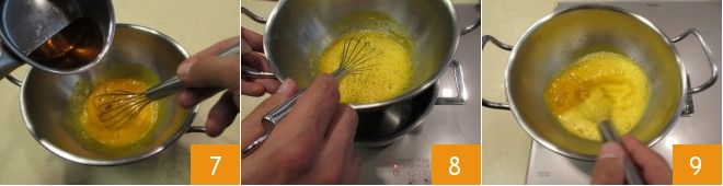 Geben Sie die Eigelbe in eine Metallschüssel und schlagen Sie sie mit einem Schneebesen, während Sie den restlichen Zucker hinzufügen 4; schlagen Sie weiter, bis Sie eine homogene Mischung erhalten 5, dann fügen Sie zuerst einen kleinen Schöpflöffel des warmen Likörs hinzu 6, um die Mischung zu temperieren.