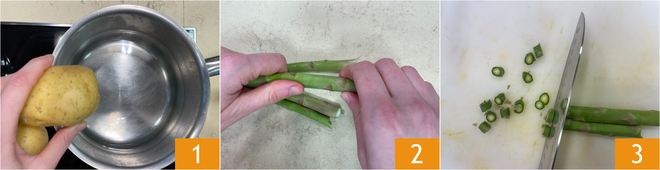 Um die Bällchen aus Agretti, Spargel und Zucchini zuzubereiten, zuerst die Kartoffeln in kaltes Wasser legen 1 und ab dem Kochen ca. 30-40 Minuten garen, bis sie weich sind. In der Zwischenzeit das Gemüse vorbereiten: die harten Enden der Spargelstiele entfernen 2 und den Spargel in Scheiben schneiden 3.