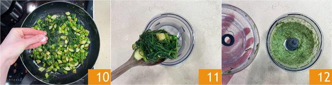 Bei mittlerer Hitze etwa 10 Minuten anbraten und mit Salz 10 und Pfeffer abschmecken. Sobald das Gemüse gar ist, den Knoblauch entfernen und alles in einen Mixer geben 11. Pürieren, bis eine cremige Konsistenz erreicht ist 12.