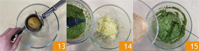 Nach der Garzeit die Kartoffeln abgießen und in einer Schüssel zerdrücken 13. Die Gemüsecreme 14 und die Semmelbrösel 15 unterrühren.