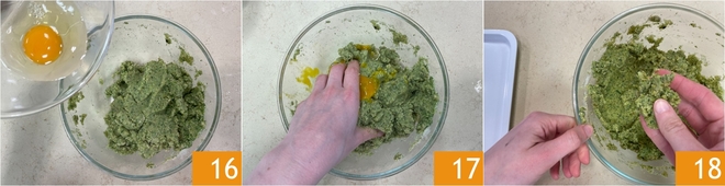 Gebt außerdem das Ei 16 und eine Prise Salz dazu und verknetet alles mit den Händen, bis die Masse gut verbunden ist 17. Sollte die Mischung zu weich sein, die Konsistenz mit mehr Semmelbröseln oder geriebenem Käse anpassen. Jeweils etwa 25 g Teig entnehmen 18.