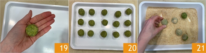 Formt Bällchen mit einem Durchmesser von etwa 5 cm 19 und legt sie nach und nach auf ein Tablett; mit diesen Mengen erhaltet ihr rund 30 Stück 20. Nachdem alle Bällchen geformt sind, wälzt sie in Semmelbröseln, sodass sie gleichmäßig bedeckt sind 21.