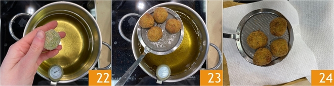 Nun das Pflanzenöl auf 180C erhitzen. Nur wenige Bällchen auf einmal hineingeben 22 und 2-3 Minuten frittieren. Wenn sie schön goldbraun sind, herausnehmen 23 und auf Küchenpapier abtropfen lassen 24.