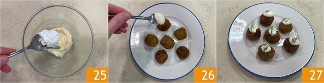 In der Zwischenzeit die Sauce zubereiten, indem ihr Mayonnaise mit Meerrettich verrührt 25. Jedes Bällchen mit einem Klecks Sauce 26 und etwas Fenchelgrün garnieren. Eure Agretti-, Spargel- und Zucchinibällchen sind servierbereit 27!