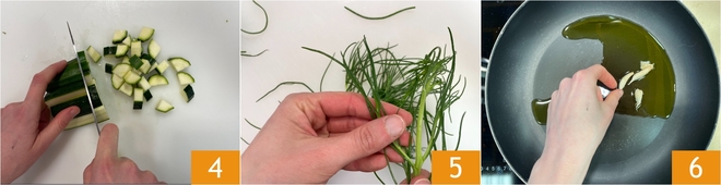 Die Zucchini an den Enden kürzen und in Würfel schneiden 4. Zum Schluss die härteren Stiele der Agretti entfernen 5. In einer beschichteten Pfanne etwas Öl mit dem Knoblauch erhitzen, damit es Geschmack annimmt 6.