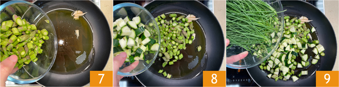 Gebt den Spargel 7, die Zucchini 8 und die Agretti 9 hinzu.