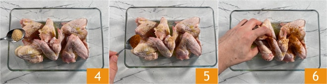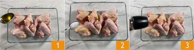 Um die glasierten Hähnchenflügel mit Sojasauce zuzubereiten, legen Sie zuerst die Flügel in eine Auflaufform oder eine Schüssel, dann würzen Sie sie mit Öl 1, Salz 2 und Pfeffer 3.