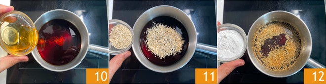 Fahren Sie mit dem Honig 10, den Sesamsamen 11 und der Maisstärke 12 fort. Gut mit einem Schneebesen verrühren.