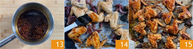 Kochen Sie für 2 Minuten, gerade genug Zeit, um die Sauce eindicken zu lassen 13. Bestreichen Sie die Flügel mit der Sauce 14 und backen Sie sie im Umluftofen bei 200°C für 10 Minuten. Die glasierten Hähnchenflügel mit Sojasauce sind bereit, heiß genossen zu werden 15!