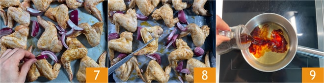 Platzieren Sie die Flügel auf einem mit Backpapier ausgelegten Blech und fügen Sie die in Spalten geschnittene Zwiebel hinzu 7. Backen Sie sie im statischen Ofen bei 200°C für 20 Minuten, drehen Sie die Flügel um 8 und setzen Sie das Backen bei denselben Bedingungen für weitere 20 Minuten fort. Bereiten Sie in der Zwischenzeit die Sauce zu, indem Sie Apfelessig und Sojasauce in einen kleinen Topf geben 9.