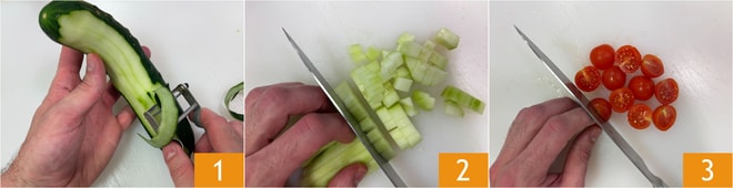 Um die frittierten Sardellen zuzubereiten, beginnen Sie mit dem frischen Beilagensalat: Schälen Sie die Gurke 1 und schneiden Sie sie in Würfel 2. Waschen und halbieren Sie die Kirschtomaten 3.