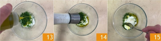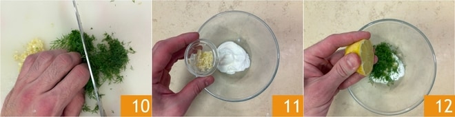 Hacken Sie auch den Dill 10. In eine Schüssel geben Sie den griechischen Joghurt, den gehackten Knoblauch, den Dill und würzen Sie mit Zitronensaft 12.