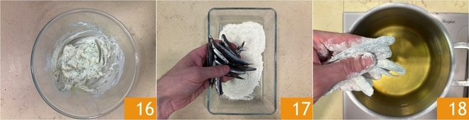 Halten Sie auch die Sauce kühl 16 und gehen Sie zum Frittieren der Sardellen über: Stellen Sie sicher, dass sie gut gereinigt und trocken sind. Geben Sie das Mehl in eine Schüssel und mehlieren Sie die Sardellen, entfernen Sie den Überschuss 17. Erhitzen Sie das Pflanzenöl auf etwa 180 °C und frittieren Sie wenige Sardellen auf einmal für etwa 3-4 Minuten 18.