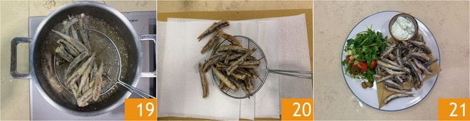 Wenn die Sardellen knusprig und goldbraun sind 19, lassen Sie sie auf einem mit Küchenpapier ausgelegten Teller abtropfen 20 und fügen Sie eine Prise Salz hinzu. Servieren Sie Ihre frittierten Sardellen mit dem frischen Salat und der Joghurtsauce 21!