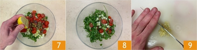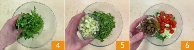 Geben Sie in eine Schüssel den Rucola 4, die Gurken 5, die Kirschtomaten und die entsteinten Taggiasca-Oliven 6.