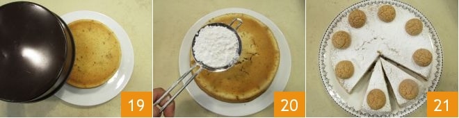 Sobald er lauwarm ist, können Sie die Form vorsichtig entfernen 19 und wenn er vollständig abgekühlt ist, bestäuben Sie die Oberfläche mit Puderzucker 20. Zum Schluss dekorieren Sie Ihre Amarettitorte, indem Sie diese entlang des gesamten Umfangs des Kuchens anordnen 21.