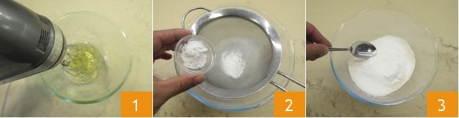 Um die Amarettitorte zuzubereiten, beginnen Sie damit, sicherzustellen, dass die Zutaten Zimmertemperatur haben. Trennen Sie die Eier (Sie benötigen 120 g Eiweiß und 80 g Eigelb) und schlagen Sie das Eiweiß steif und stellen Sie es beiseite 1. Fahren Sie fort, indem Sie in einer Schüssel die trockenen Zutaten sieben: Mehl, Speisestärke und Backpulver 2, dann mischen Sie diese mit einem Löffel 3.