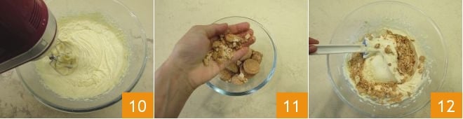 Sobald alle Zutaten vermischt sind 10, stoppen Sie die Rührbesen. Zerbröseln Sie die Amaretti in einer Schüssel mit der Hand, um grobe Krümel zu erhalten 11, und fügen Sie diese dann der Mischung hinzu. Verwenden Sie einen Spatel, um alles zu vermischen 12.