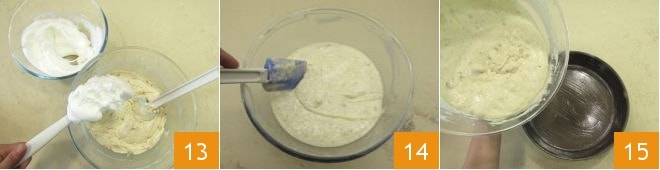 Fügen Sie auch das zuvor geschlagene Eiweiß hinzu. Ein Teil wird hinzugefügt und gemischt, um die Mischung zu erweichen 13; den restlichen Teil können Sie vorsichtig mit Bewegungen von unten nach oben unterheben. Jetzt ist die Mischung bereit 14, um in eine bereits gebutterte 24 cm Springform gegossen zu werden (es gibt keine Notwendigkeit, sie zu mehlen) 15.