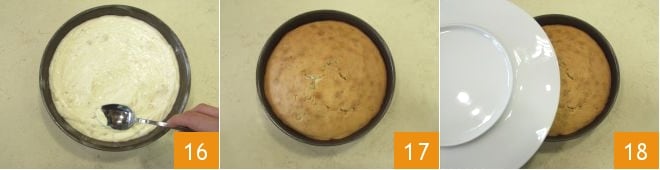 Glätten Sie die Oberfläche sorgfältig mit einem Löffel 16 und backen Sie dann im vorgeheizten statischen Ofen bei 200° für etwa 35 Minuten. Nach dem Backen 17 stürzen Sie den noch warmen Kuchen auf einen Teller 17 und lassen Sie ihn kopfüber abkühlen 18.