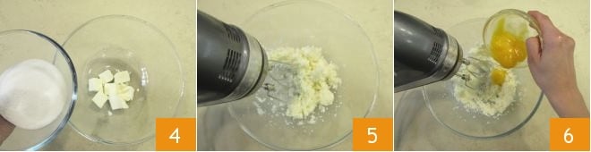 Fahren Sie fort, indem Sie in einer Schüssel die weiche Butter bei Zimmertemperatur und den Zucker 4 geben und mit den Rührbesen schlagen, bis die Mischung hell und schaumig ist 5. Während die Rührbesen noch in Betrieb sind, fügen Sie nach und nach die Eigelbe hinzu 6.