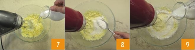 Wenn alles gut vermischt ist, geben Sie nach und nach die restlichen Zutaten abwechselnd hinzu: etwas Mandelmilch 7, einige der zuvor gesiebten trockenen Zutaten 8, dann wieder etwas Milch 9 und so weiter, während Sie die Rührbesen weiter verwenden, um die Mischung zu vereinigen.