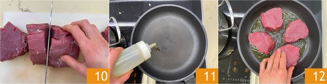 In der Zwischenzeit säubern Sie das Filet, indem Sie die äußere Membran entfernen, und schneiden Sie Medaillons von 250 g 10, dann tupfen Sie sie mit Küchenpapier ab, um sie gut zu trocknen. Erhitzen Sie in einer großen Pfanne etwas extra-natives Olivenöl bei mittlerer bis hoher Hitze 11 und legen Sie die Medaillons hinein, wenn es gut heiß ist 12.