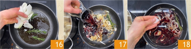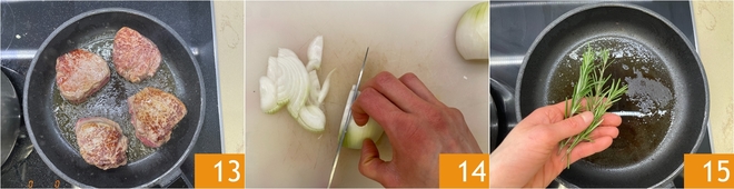Braten Sie sie 2-3 Minuten pro Seite an, bis sich eine schöne Kruste bildet 13, dann legen Sie sie auf einen Teller und halten Sie sie warm. Nun schälen und schneiden Sie die Zwiebel 14. In derselben Pfanne, in der Sie das Fleisch angebraten haben, erhitzen Sie einen Schuss Öl mit dem Rosmarin 15.