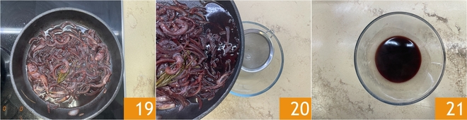 Wenn die Zwiebeln weich und der Boden reduziert ist 19, filtern Sie alles durch ein Sieb 20, um eine glatte Sauce zu erhalten 21.