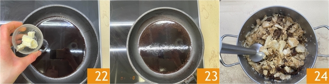 Geben Sie den gefilterten Fond zurück in die Pfanne und fahren Sie mit dem Kochen weitere 10 Minuten fort, bis das Volumen um etwa zwei Drittel reduziert ist. Schalten Sie dann die Hitze aus und fügen Sie die sehr kalte Butter in Würfeln hinzu 22, indem Sie die Pfanne schwenken, um sie zu schmelzen und die Sauce zu emulgieren, bis sie glänzend und samtig wird; behalten Sie sie bei Seite 23. Nehmen Sie den gekochten Blumenkohl mit den Pilzen und pürieren Sie ihn mit einem Stabmixer 24.
