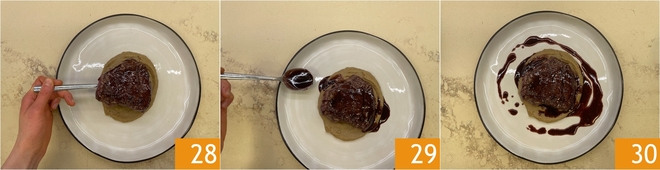 Legen Sie das Fleisch darauf 28 und vollenden Sie es mit der Weinsauce 29. Servieren Sie Ihr Amarone-Rinderfilet sofort 30!