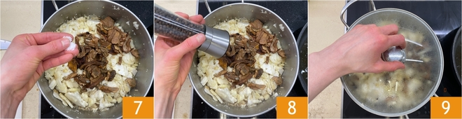 Fügen Sie den Blumenkohl hinzu 4 und braten Sie ihn kurz an. Nehmen Sie die eingeweichten Pilze und geben Sie sie zum Blumenkohl 5, zusammen mit ihrem gefilterten Einweichwasser 6.