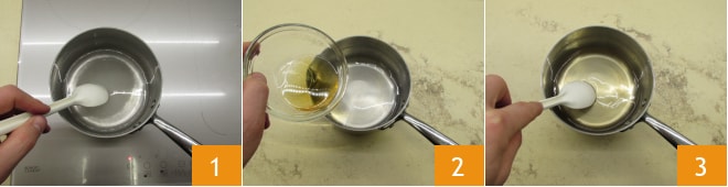 Bereiten Sie jetzt die Rumtränke vor. Geben Sie in einen Topf Wasser und Zucker, rühren Sie auf hoher Flamme 1, bis der Zucker vollständig aufgelöst ist. Außerhalb der Flamme geben Sie den Rum hinzu 2, so dass ein großer Teil des Alkohols verdampft, und rühren Sie gut um 3. Lassen Sie es abkühlen.