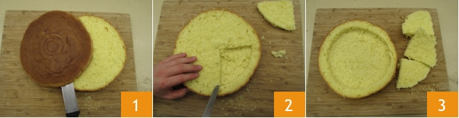Fahren Sie mit dem Zusammensetzen fort. Nehmen Sie den Biskuit und schneiden Sie die Kappe bei etwa 1 cm ab und legen Sie sie beiseite 1. Dann schneiden Sie mit einem scharfen Messer die Umrandung der Torte auf etwa 2-3 cm vom Rand 2 ab und schneiden Sie die Torte, um das Innere zu gewinnen, ohne die Basis zu durchschneiden, und lassen Sie etwa 2 cm 3.