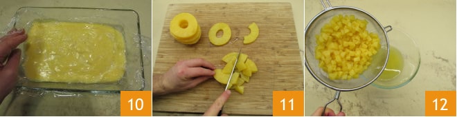 Geben Sie die Creme in eine Schüssel, decken Sie sie mit Frischhaltefolie ab 10 und lassen Sie sie bei Raumtemperatur vollständig abkühlen. Nehmen Sie die Ananas, lassen Sie sie abtropfen und schneiden Sie sie in Würfel, die weniger als einen Zentimeter groß sind, und lassen Sie sie 20 Minuten abtropfen 12.