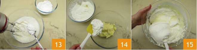 Schlagen Sie die kalte Sahne in einer großen Schüssel mit den Schneebesen bei mittelhoher Geschwindigkeit und fügen Sie den Puderzucker löffelweise hinzu 13. Schlagen Sie, bis Sie eine steife Masse erhalten. An diesem Punkt machen Sie aus der Konditorcreme eine Diplomatische Creme, indem Sie zuerst die Hälfte der geschlagenen Sahne energisch unterrühren 14. Dann fügen Sie den Rest hinzu und arbeiten Sie ihn sanfter mit Bewegungen von unten nach oben ein 15.