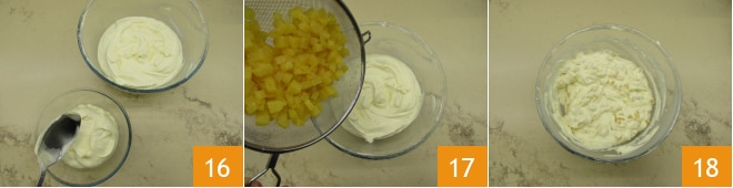 Nehmen Sie 400 g Creme und geben Sie sie in eine kleine Schüssel 16, sie wird für die Abdeckung benötigt. Fügen Sie in den restlichen Teil die abgetropften Ananaswürfel hinzu 17 und rühren Sie gut um 18. Wenn Sie die beiden Cremes nicht sofort verwenden, bedecken Sie sie mit Frischhaltefolie und bewahren Sie sie im Kühlschrank auf.