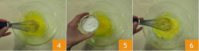 schlagen Sie kurz 4, dann fügen Sie die Maisstärke hinzu 5 und rühren Sie erneut mit dem Schneebesen 6, bis Sie eine homogene Masse erhalten.
