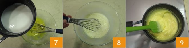 Sobald die Milch zu kochen beginnt, entfernen Sie die Vanilleschote aus der Milchmischung und gießen Sie sie langsam ein 7, während Sie mit dem Schneebesen umrühren 8. Geben Sie alles zurück in den Topf und kochen Sie die Creme, bis sie eingedickt ist 9.