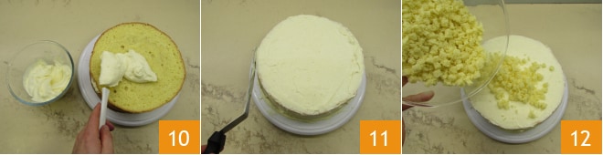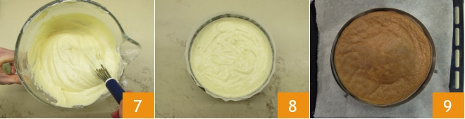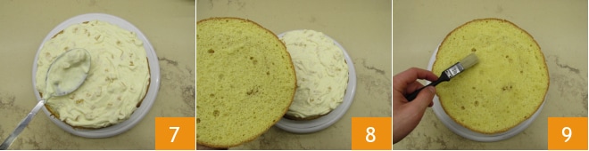 Glätten Sie sorgfältig mit einem Löffel 7 und legen Sie die zuvor beiseite gestellte Scheibe darauf: Legen Sie die farbigere Seite in Kontakt mit der Ananas-Creme 8. Befeuchten Sie auch die Oberfläche der Torte 9.