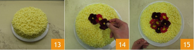 und drücken Sie sanft mit den Händen an, um die gesamte Oberfläche vollständig zu bedecken 13. Lassen Sie sie 3-4 Stunden im Kühlschrank härten und dekorieren Sie dann mit essbaren Blumen 14 bevor Sie servieren 15. Hier ist Ihre Ananas-Mimosa-Torte fertig.