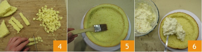 Schneiden Sie das Innere des Biskuits in halbe Zentimeter große Würfel und sammeln Sie sie in einer Schüssel 4. Befeuchten Sie das Innere der Torte mit einem Pinsel 5 und geben Sie dann die Creme mit den Ananaswürfeln in die Mitte 6.