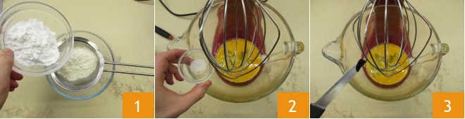 Um die Ananas-Mimosa-Torte zuzubereiten, beginnen Sie mit dem Biskuitteig. Sieben Sie in einer Schüssel Mehl und Kartoffelstärke zusammen 1. Schneiden Sie die Vanilleschote der Länge nach auf und entnehmen Sie die Samen, indem Sie sie mit einem Messer herausschaben. Geben Sie in die Schüssel einer Küchenmaschine mit Schneebesen die Eier, eine Prise Salz 2 und die Samen der Vanilleschote 3.