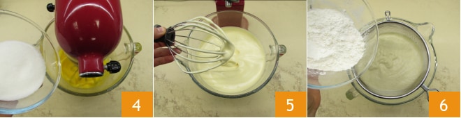 Fügen Sie den Zucker hinzu und schlagen Sie alles mindestens 10 Minuten lang bei mittlerer Geschwindigkeit, bis eine aufgeblähte, helle und schaumige Masse entsteht 5. Schalten Sie die Küchenmaschine aus, positionieren Sie ein Sieb in der Schüssel und sieben Sie erneut die Mehl- und Kartoffelstärkemischung 6.